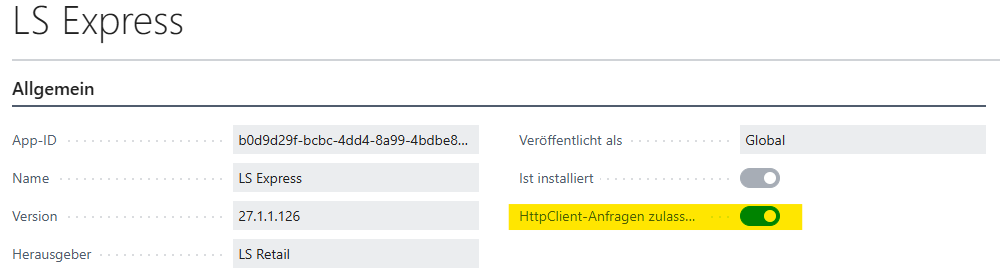 - In der Erweiterungsverwaltung muss bei beiden LS Retail Erweiterungen (LS Express und LS Express System) das Feld HttpClient-Anfragen zulassen aktiviert sein.