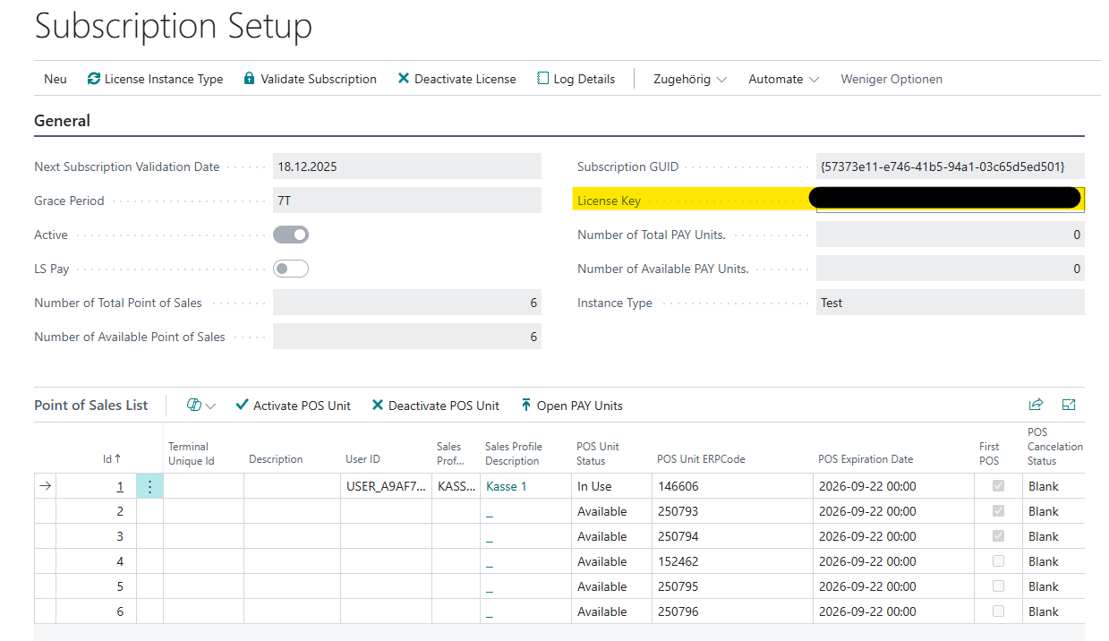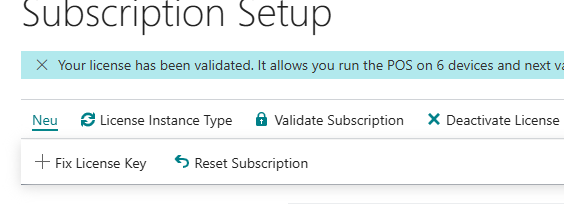 Danach sollten die Point of Sale in der Liste erscheinen. Sollte dies nicht der Fall sein kann über den Menüpunkt Neu über den Button Fix License Key mit dem vorgeschlagenen License Key {00000000-0000-0000-0000-000000000000} und im Anschluss über den Button Reset Subscription die Einrichtung auf der Page zurücksetzten, so das dann der License Key neu eingetragen werden kann.